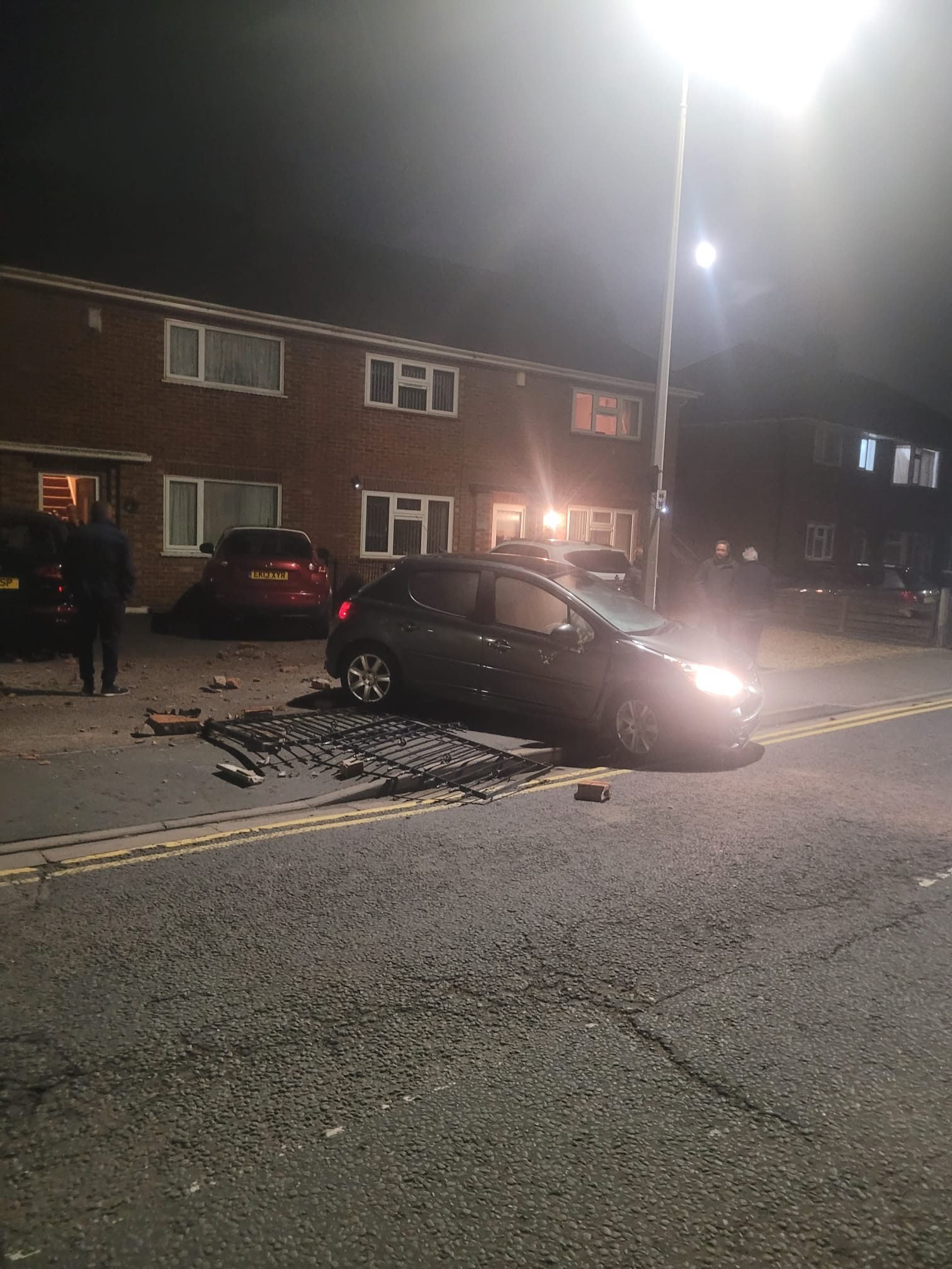 A photo from the scene shows a black Peugeot surrounded by brick debris and on top of a metal fence.