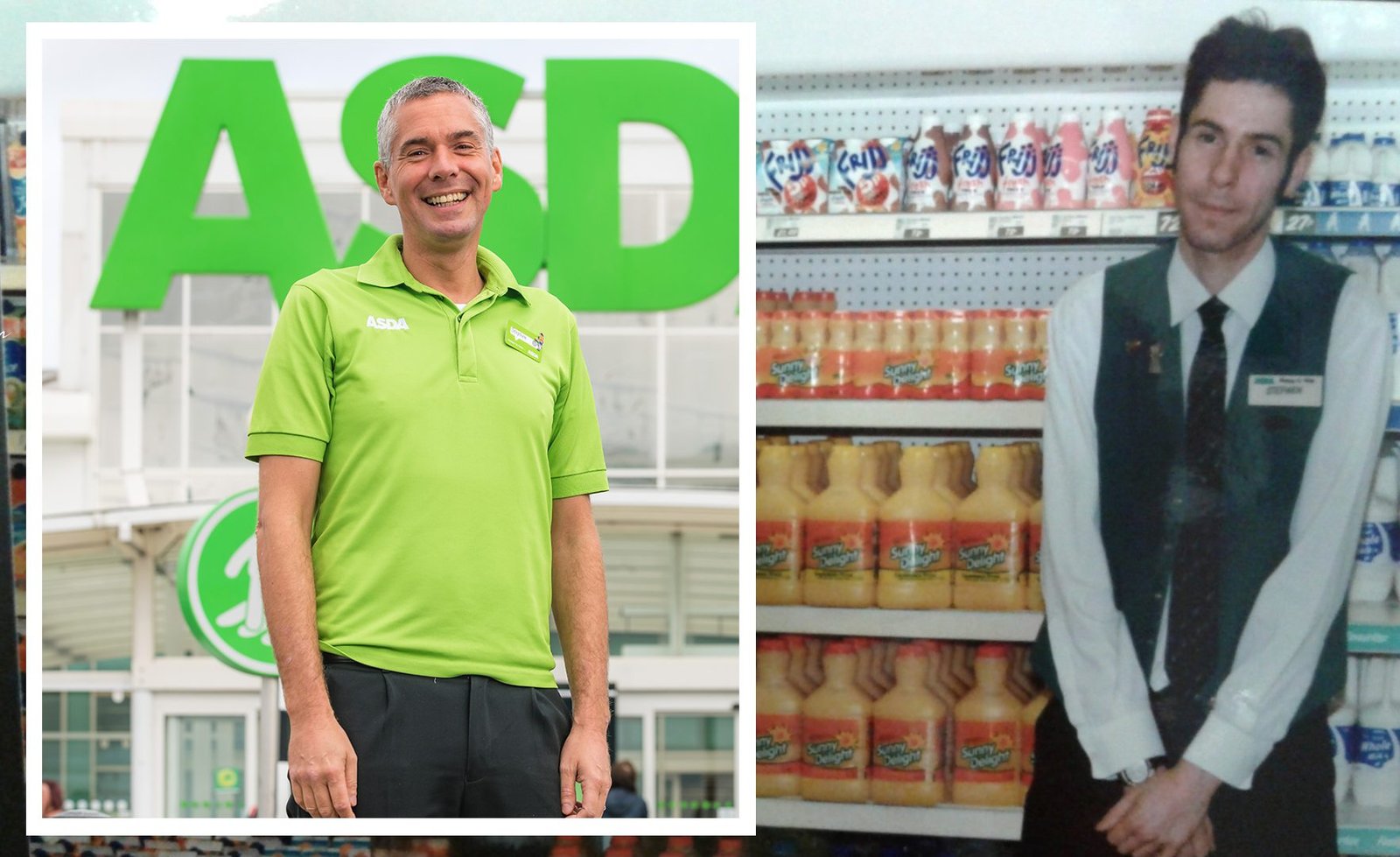 (L) Stephen outside Asda’s Lister Way store in 2026; (R) Stephen in Asda’s store in 1999