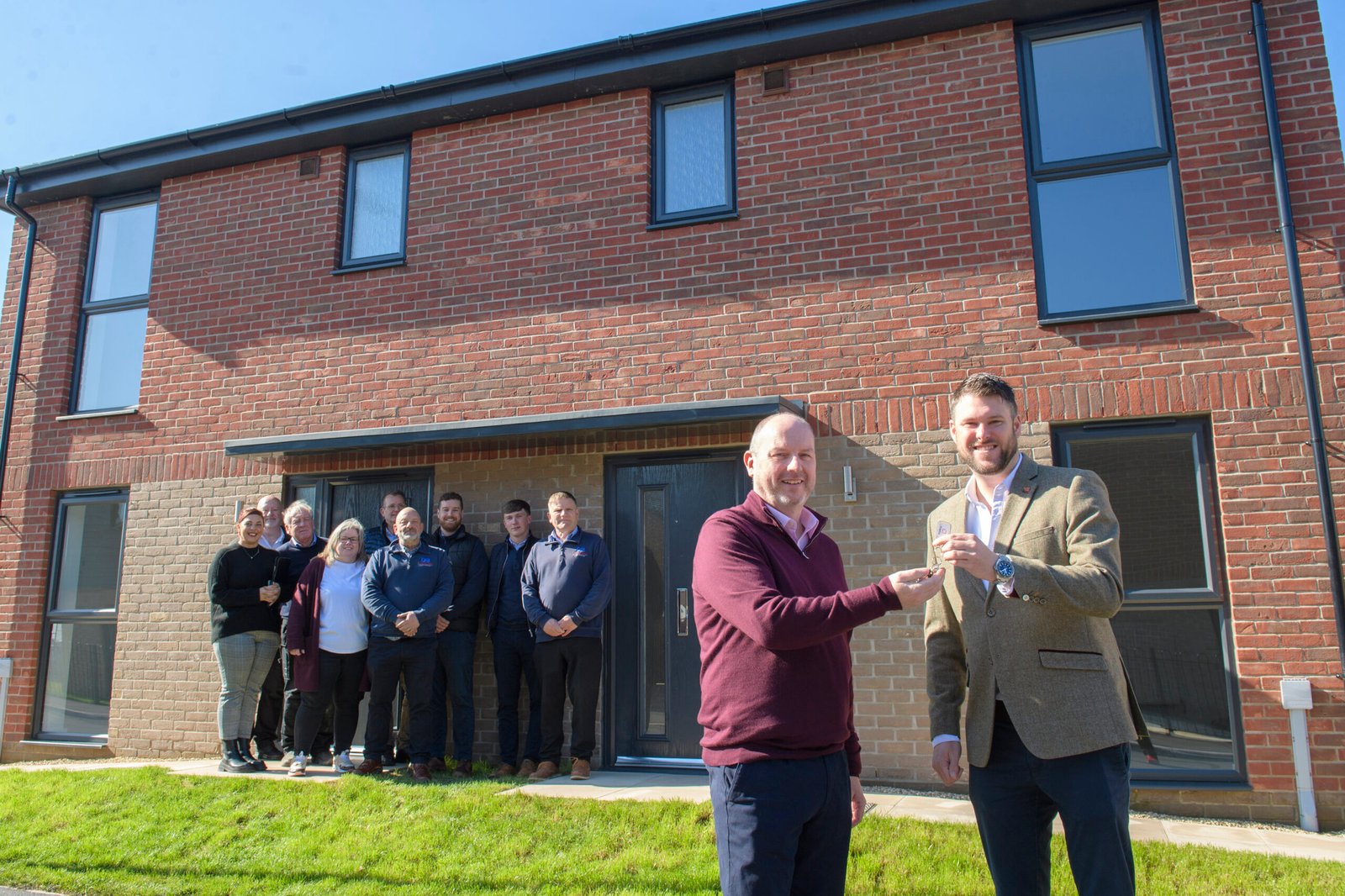 Simon Dillon (front left), Development Manager at Amplius, receive the keys from Adam Mayer, Managing Director of D Brown Building Contractors, watched by colleagues from the two organisations.