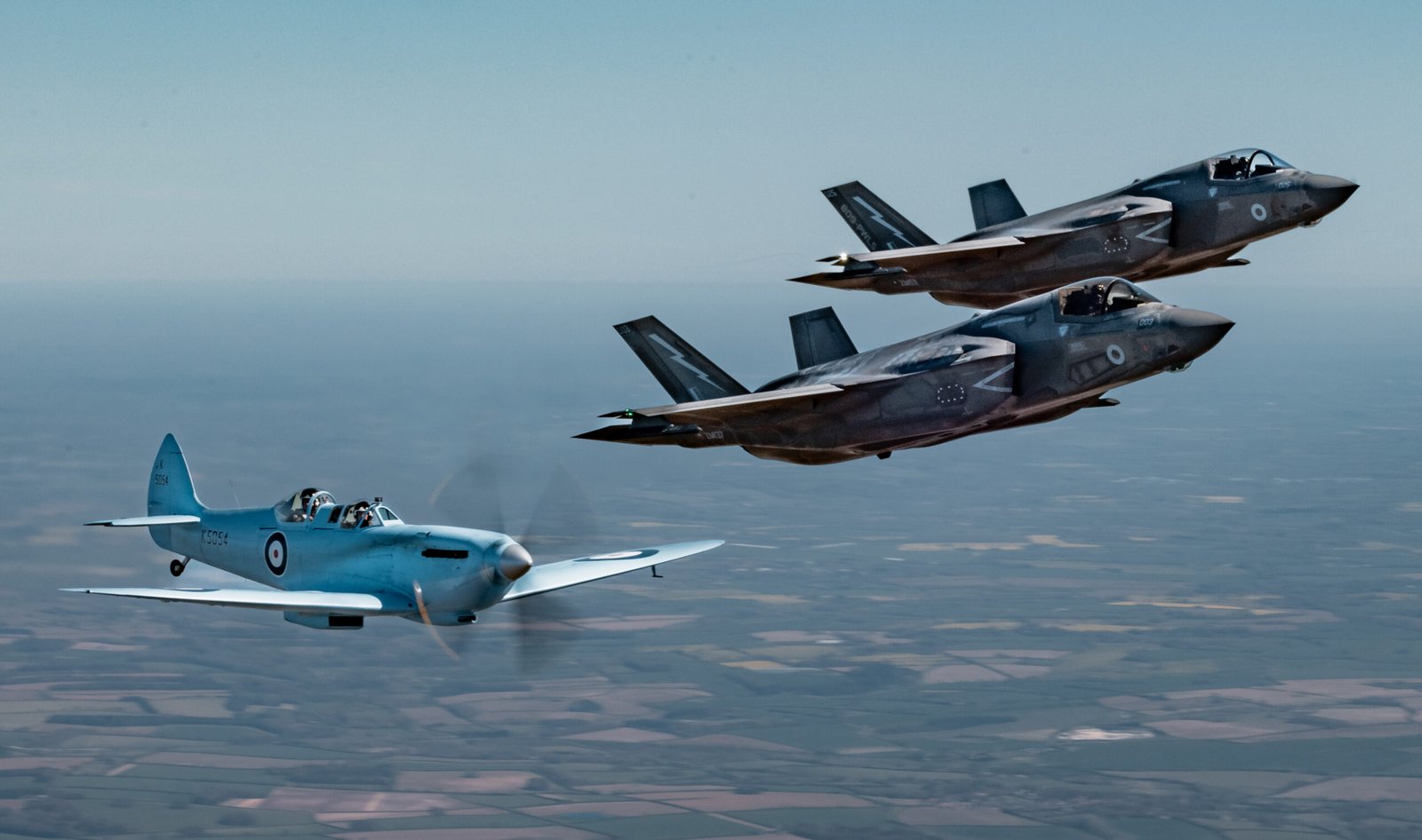 Spitfire “K5054” during transit to RAF Coningsby on the first flight of the Spitfire90 tour, alongside two F35 Lightning II Jets from RAF Marham. (Photo: Crown Copyright)